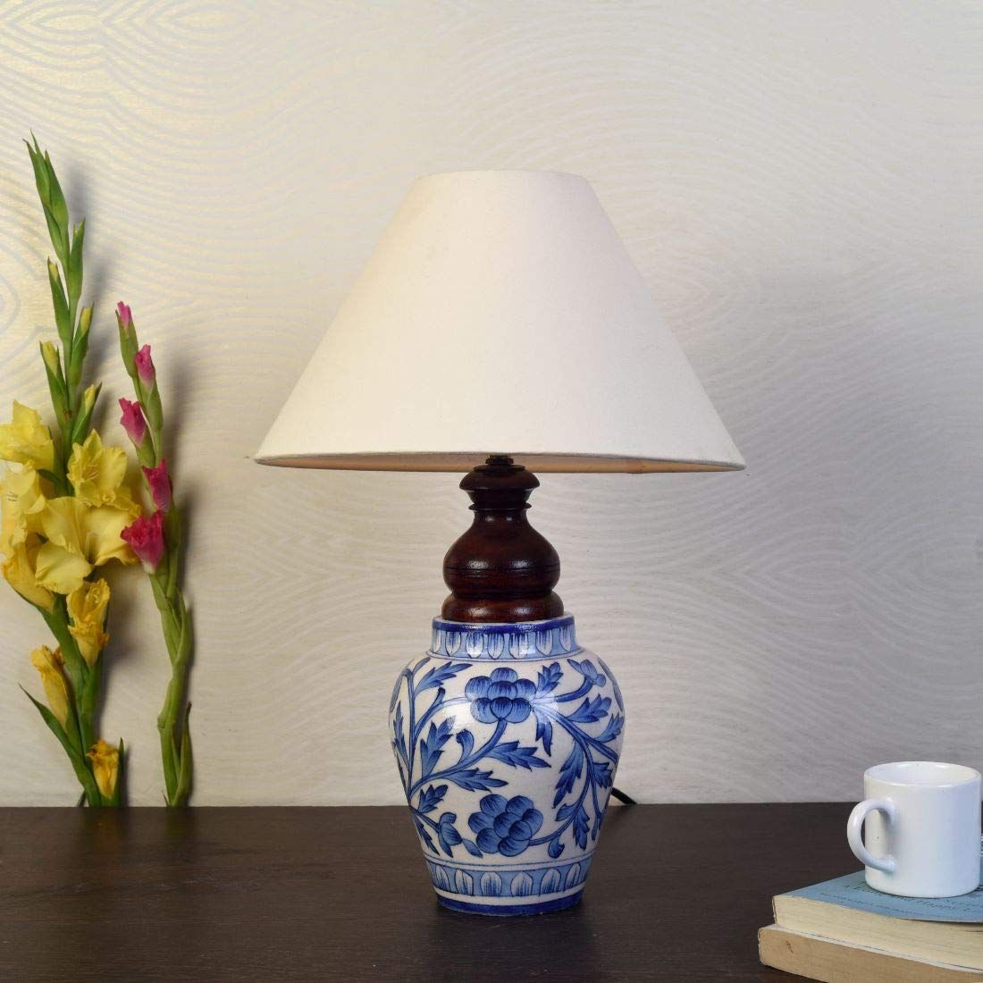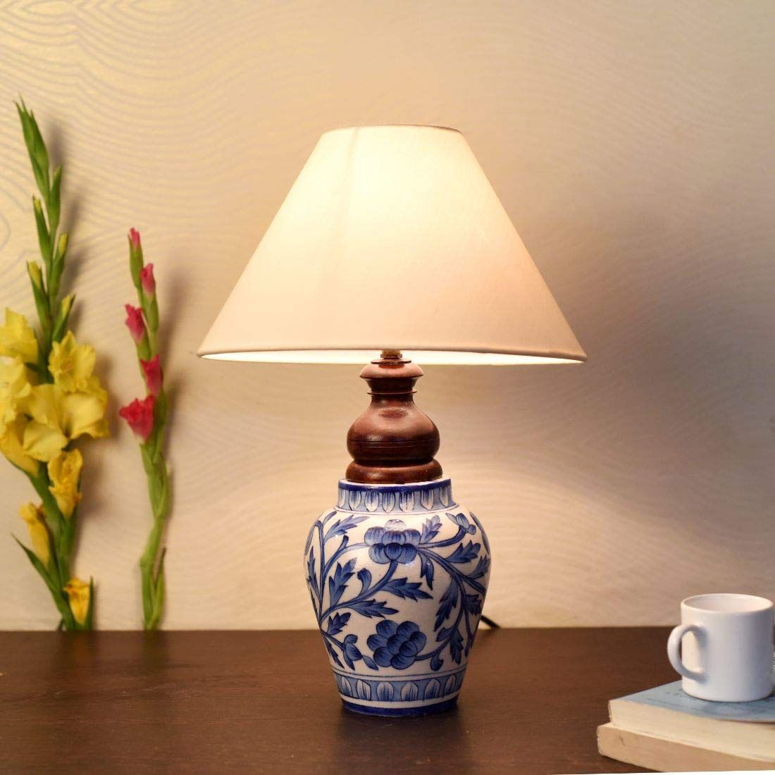 This handpainted ceramic lamp will add an ethnic touch to your living room. Place it on the bed side table or a study table, it will equally make the place graceful. It has a cute Matki shape with Mugal art painting done by the artisans from Rajasthan.This work is also known as Blue pottery work.Blue pottery started during the reign of Sawai Ram Singh II during 19th century, Blue Pottery is famous for the exquisite designs and excellent craftsmanship.If you want to lift the aesthetic feel of the interior of your house, then add this lamp.It can also be gifted to family and friends and they would love it!