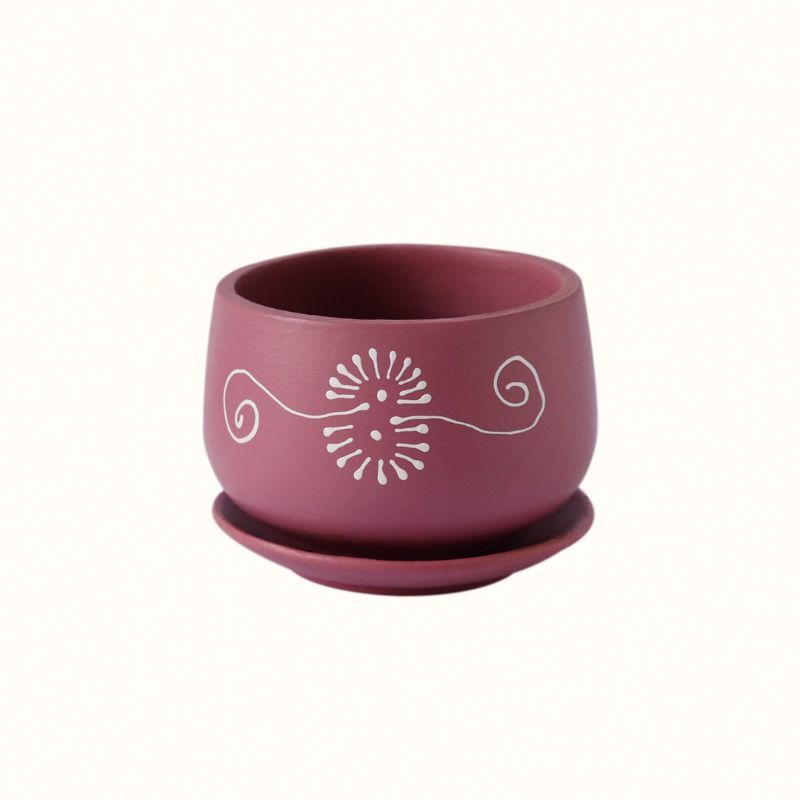 Unravel India "Flower Motif" maroon handmade & handpainted planter pot with tray in terracotta