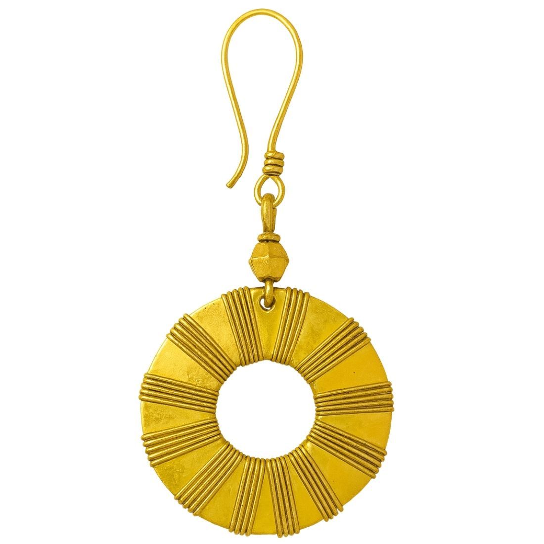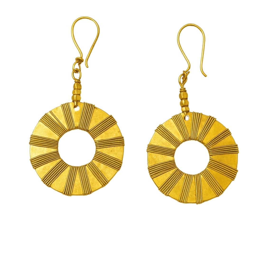 "Inspired by the rising sun and tribal artistry, these radiant disc earrings by Unravel India are handcrafted in brass with bold, carved symmetry. The etched segments alternate with a matte finish to give an illusion of light and motion — making them ideal for styling with both ethnic wear and modern minimal outfits.