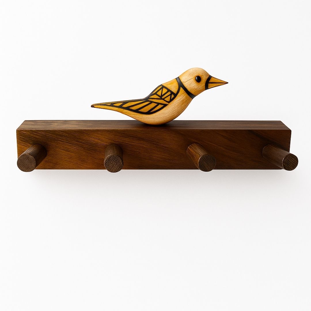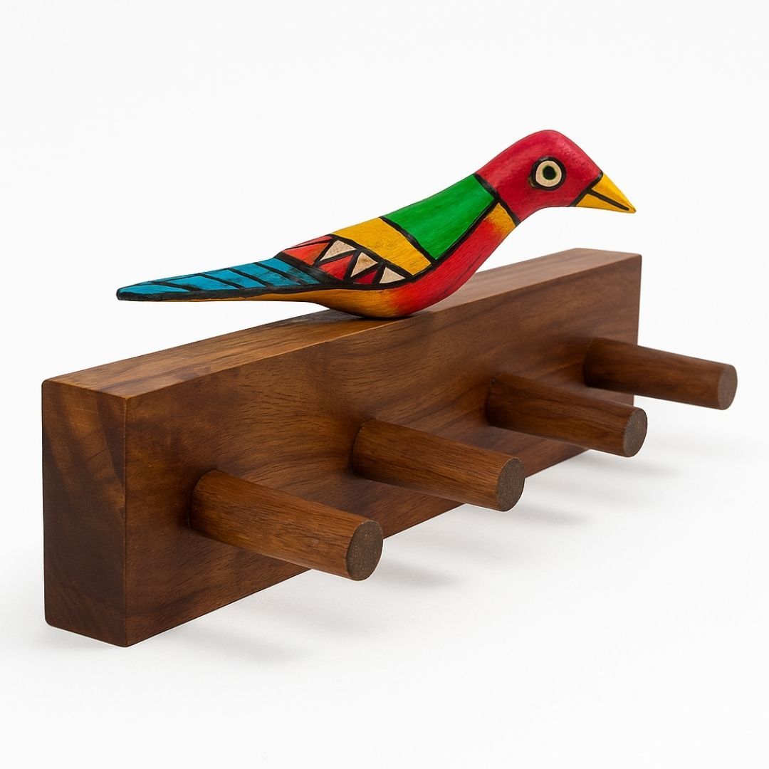 "Bring function and charm to your entryway with this handcrafted wooden key holder. Featuring a smooth natural wood finish and topped with a hand-carved bird figurine, it combines practicality with artistic flair. The four sturdy peg hooks offer ample space to hang your keys, keychains, or small accessories, keeping them organized and within easy reach."