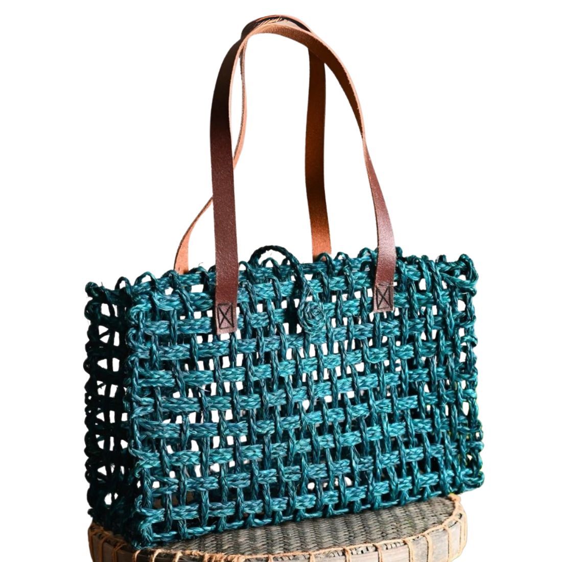 Add a touch of elegance to your everyday look with this emerald green woven tote bag. Meticulously handcrafted with durable natural fibers, the bag features an intricate open-weave design that is both lightweight and stylish. The brown leather handles provide a strong and comfortable grip, making it perfect for shopping, office, or casual outings. Spacious yet chic, this tote blends functionality with artisanal beauty.