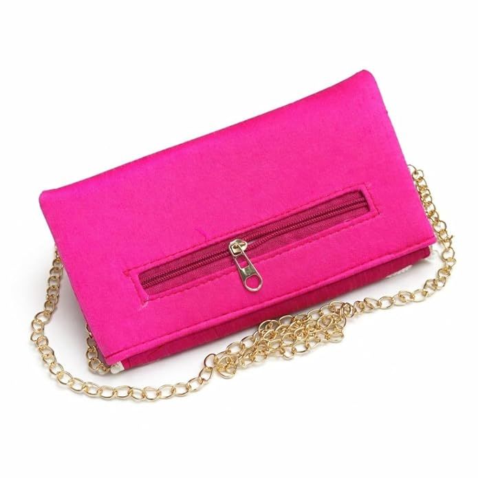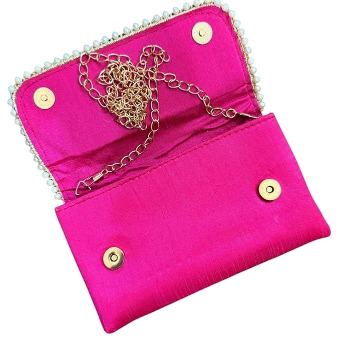 This hot pink pearl embroidered clutch bag for women is perfect for weddings and parties. Traditional ethnic clutch purse with handcrafted pearl work, chain strap and elegant finish.
