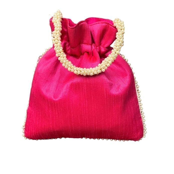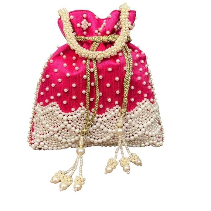 Unravel India Handcrafted Hot Pink Velvet Pearl Potli Bag for Women | Bridal Wedding Potli