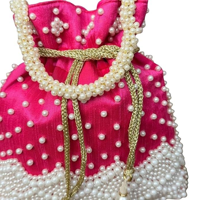 This premium handcrafted pearl potli bag for women is designed to enhance your ethnic fashion and wedding styling. Made with fine quality silk fabric and decorated with heavy pearl bead embroidery, this designer potli handbag offers a rich traditional look perfect for bridal wear, festive outfits, and party functions. The elegant craftsmanship makes it an ideal bridal potli bag, ethnic potli purse, and wedding clutch bag for women. This stylish potli bag for saree lehenga and suit is lightweight yet spacious enough to carry mobile phone, money, makeup, cards, and keys. The strong drawstring closure ensures safety while maintaining a classy appearance. The premium lining and durable stitching provide long-lasting use, making it a reliable traditional potli handbag for women. Perfect for wedding ceremonies, engagement functions, festive parties, reception events, and cultural celebrations, this ethnic clutch bag for women also works beautifully as a return gift potli bag, bridesmaid gift potli, and wedding gifting handbag. It is a must-have accessory for women who love traditional fashion and designer ethnic handbags. Upgrade your festive wardrobe with this elegant designer potli bag, a timeless blend of tradition, style, and utility that adds luxury charm to every outfit.