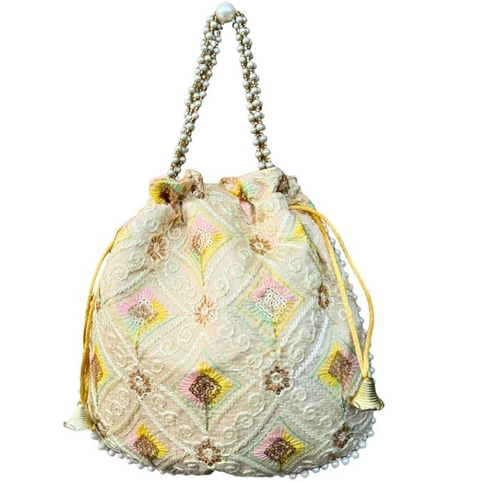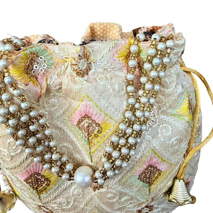 Unravel India Handcrafted Off White Brocade Pearl Potli Bag for Women | Bridal & Wedding Ethnic Handbag