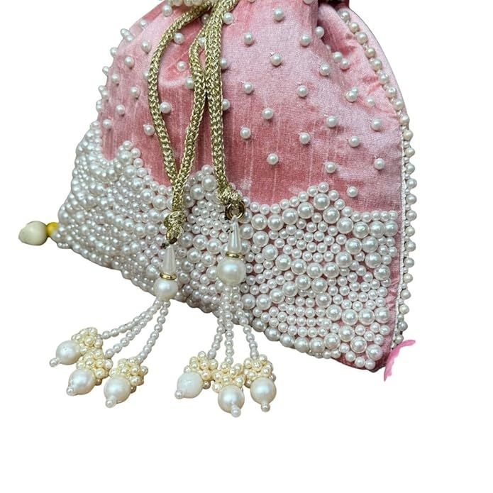 Unravel India Handcrafted Pink Velvet Pearl Potli Bag for Women | Festive & Bridal Potli Purse