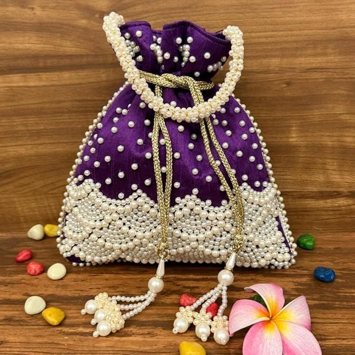 This premium handcrafted pearl potli bag for women is designed to enhance your ethnic fashion and wedding styling. Made with fine quality silk fabric and decorated with heavy pearl bead embroidery, this designer potli handbag offers a rich traditional look perfect for bridal wear, festive outfits, and party functions. The elegant craftsmanship makes it an ideal bridal potli bag, ethnic potli purse, and wedding clutch bag for women. This stylish potli bag for saree lehenga and suit is lightweight yet spacious enough to carry mobile phone, money, makeup, cards, and keys. The strong drawstring closure ensures safety while maintaining a classy appearance. The premium lining and durable stitching provide long-lasting use, making it a reliable traditional potli handbag for women. Perfect for wedding ceremonies, engagement functions, festive parties, reception events, and cultural celebrations, this ethnic clutch bag for women also works beautifully as a return gift potli bag, bridesmaid gift potli, and wedding gifting handbag. It is a must-have accessory for women who love traditional fashion and designer ethnic handbags. Upgrade your festive wardrobe with this elegant designer potli bag, a timeless blend of tradition, style, and utility that adds luxury charm to every outfit.
