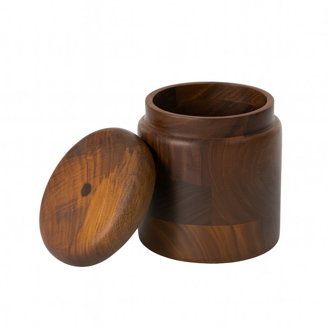 "Keep your kitchen organized in style with this handcrafted storage jar made from premium Sheesham wood. Featuring a smooth finish and snug-fit lid, this container is perfect for storing spices, condiments, tea, dry fruits, or small kitchen essentials. Its elegant grain pattern and cylindrical design add a rustic yet modern touch to your countertop.