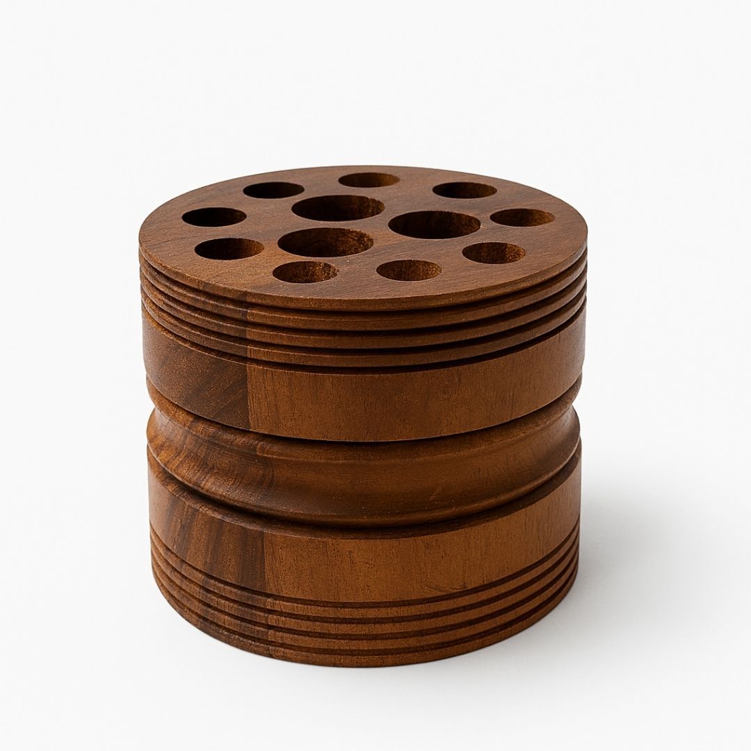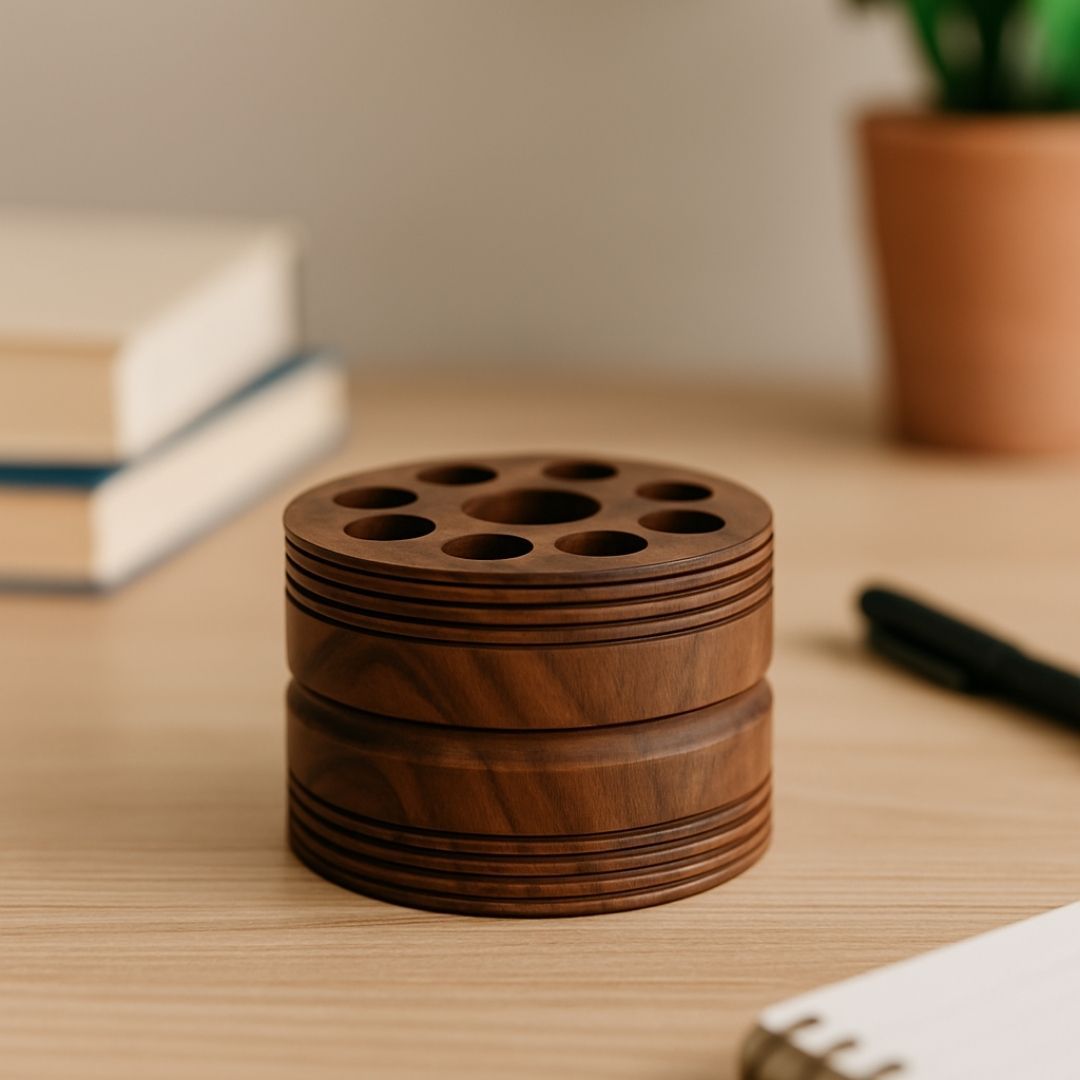 "Bring elegance and order to your workspace with this handcrafted wooden pen stand. Designed with multiple circular slots, this compact yet stylish desk organizer is perfect for holding pens, pencils, markers, and other stationery. Crafted from high-quality Sheesham wood, it adds a touch of natural warmth to any office or study table.