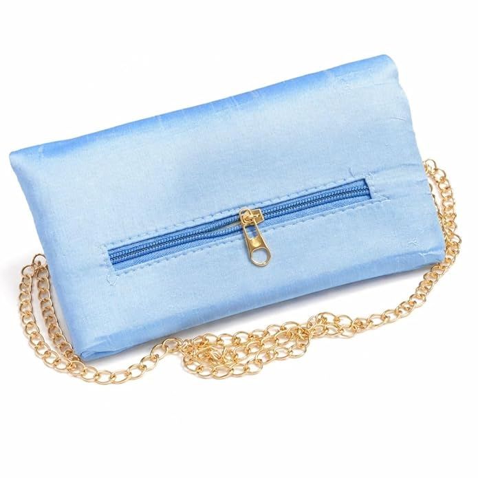 This sky blue pearl embroidered clutch bag for women is designed for parties and festive occasions. Stylish ethnic clutch purse with premium fabric, chain strap and elegant handcrafted detailing.