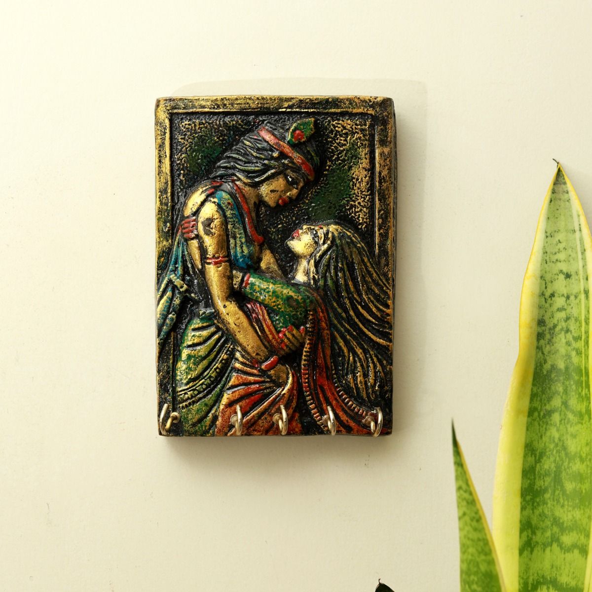 "Add a divine touch to your walls with this beautifully handcrafted key holder from Unravel India, featuring the eternal bond of Radha and Krishna. Painted in rich, ethnic hues, this wall décor not only represents spiritual love but also offers practical functionality with its sturdy key hooks. The fine detailing, textured finish, and traditional artwork make it a perfect addition to your pooja room, entryway, or hallway. Let this piece bring peace, positivity, and elegance into your living space.