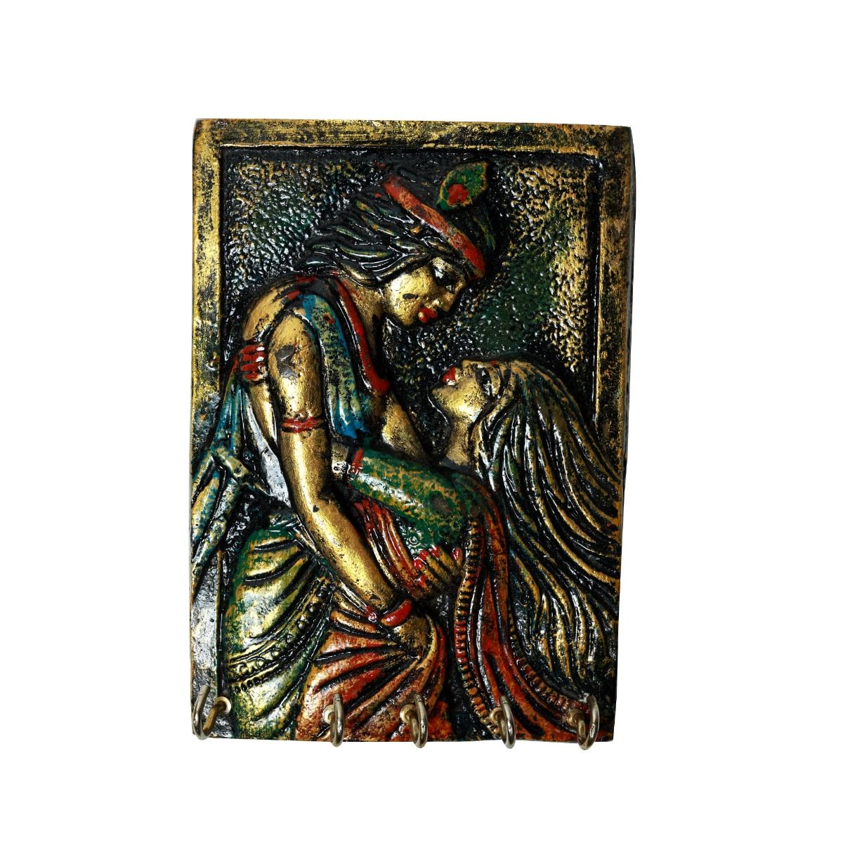 Unravel India Handcrafted Wooden Wall Hanging Key Holder Depicting Radha Krishna in Vibrant Ethnic Colors Ideal for Spiritual Home Decor and Gifting