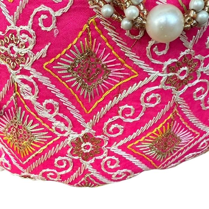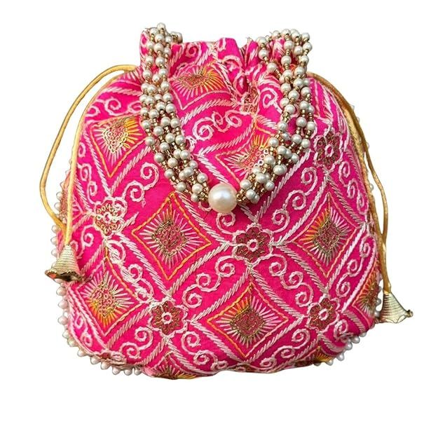 This premium handcrafted pearl potli bag for women is designed to enhance your ethnic fashion and wedding styling. Made with fine quality silk fabric and decorated with heavy pearl bead embroidery, this designer potli handbag offers a rich traditional look perfect for bridal wear, festive outfits, and party functions. The elegant craftsmanship makes it an ideal bridal potli bag, ethnic potli purse, and wedding clutch bag for women. This stylish potli bag for saree lehenga and suit is lightweight yet spacious enough to carry mobile phone, money, makeup, cards, and keys. The strong drawstring closure ensures safety while maintaining a classy appearance. The premium lining and durable stitching provide long-lasting use, making it a reliable traditional potli handbag for women. Perfect for wedding ceremonies, engagement functions, festive parties, reception events, and cultural celebrations, this ethnic clutch bag for women also works beautifully as a return gift potli bag, bridesmaid gift potli, and wedding gifting handbag. It is a must-have accessory for women who love traditional fashion and designer ethnic handbags. Upgrade your festive wardrobe with this elegant designer potli bag, a timeless blend of tradition, style, and utility that adds luxury charm to every outfit.