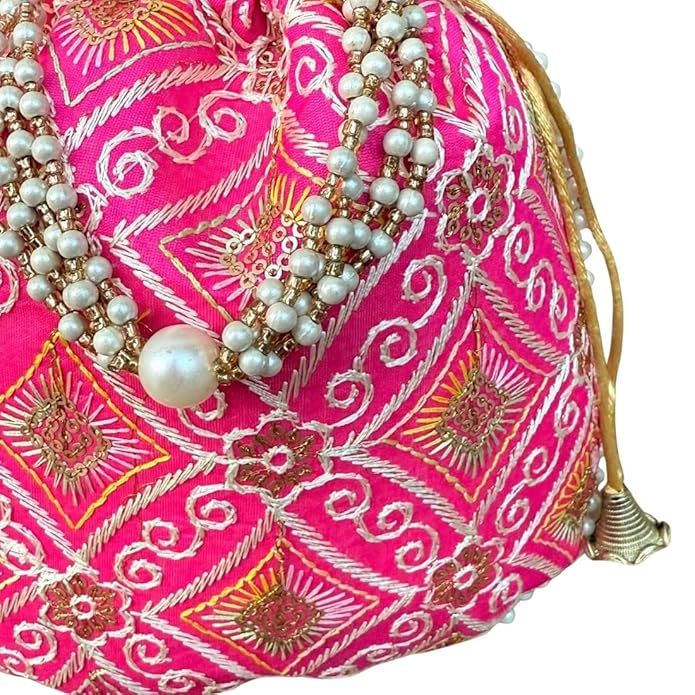 Unravel India Hot Pink Embroidered Potli Bag with Pearl Handle | Designer Ethnic Clutch for Women