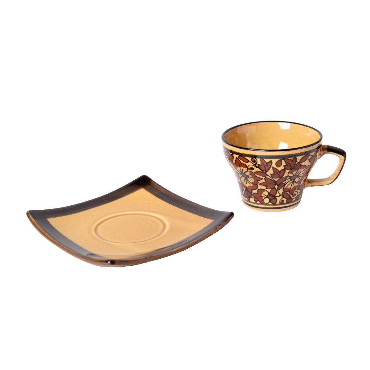 These beautiful cups and saucers, decorated in light and dark shades of brown and adorned with leaf and flower patterns, are the perfect addition to your collection of crockery.
