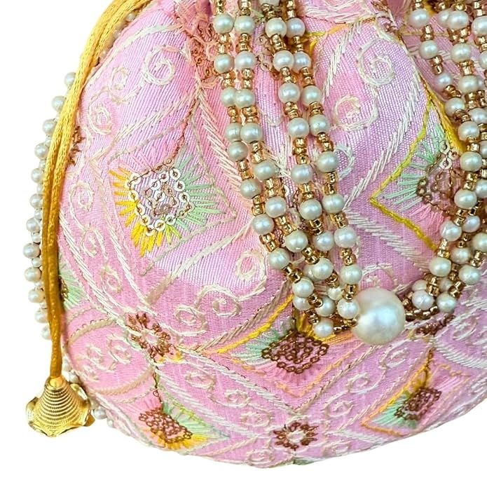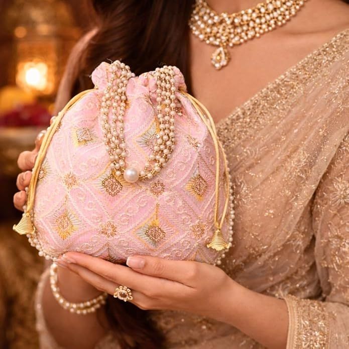 This premium handcrafted pearl potli bag for women is designed to enhance your ethnic fashion and wedding styling. Made with fine quality silk fabric and decorated with heavy pearl bead embroidery, this designer potli handbag offers a rich traditional look perfect for bridal wear, festive outfits, and party functions. The elegant craftsmanship makes it an ideal bridal potli bag, ethnic potli purse, and wedding clutch bag for women. This stylish potli bag for saree lehenga and suit is lightweight yet spacious enough to carry mobile phone, money, makeup, cards, and keys. The strong drawstring closure ensures safety while maintaining a classy appearance. The premium lining and durable stitching provide long-lasting use, making it a reliable traditional potli handbag for women. Perfect for wedding ceremonies, engagement functions, festive parties, reception events, and cultural celebrations, this ethnic clutch bag for women also works beautifully as a return gift potli bag, bridesmaid gift potli, and wedding gifting handbag. It is a must-have accessory for women who love traditional fashion and designer ethnic handbags. Upgrade your festive wardrobe with this elegant designer potli bag, a timeless blend of tradition, style, and utility that adds luxury charm to every outfit.