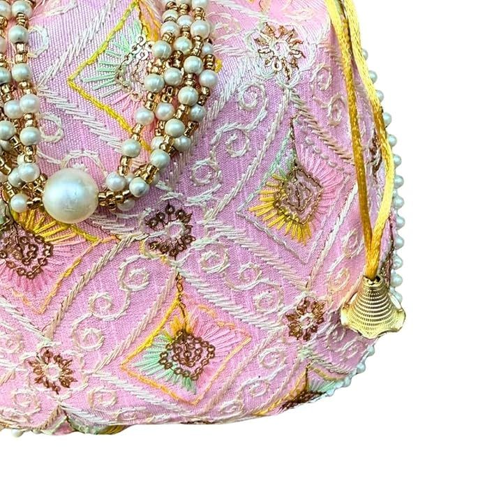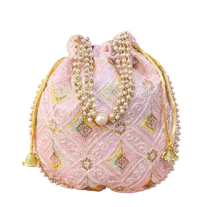 Unravel India Pastel Pink Embroidered Potli Bag with Pearl Handle | Designer Ethnic Clutch for Women