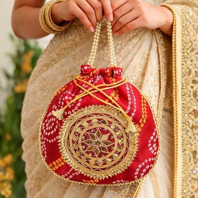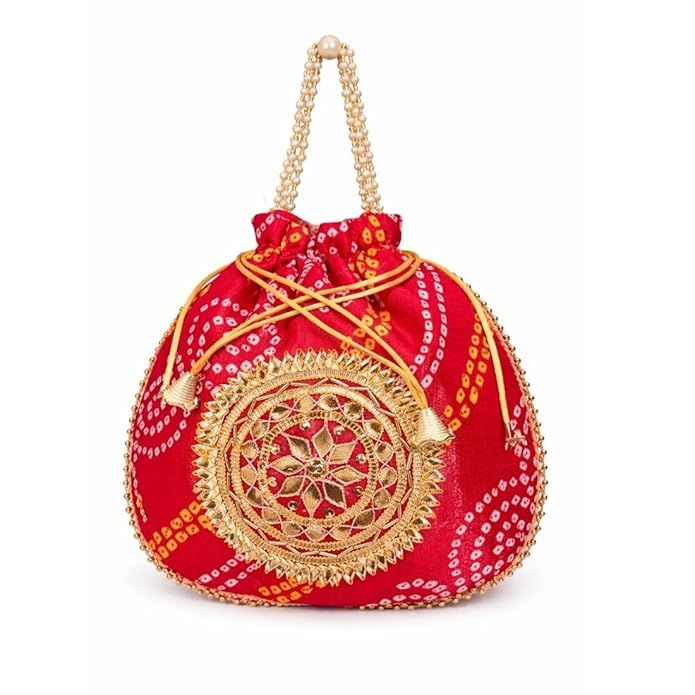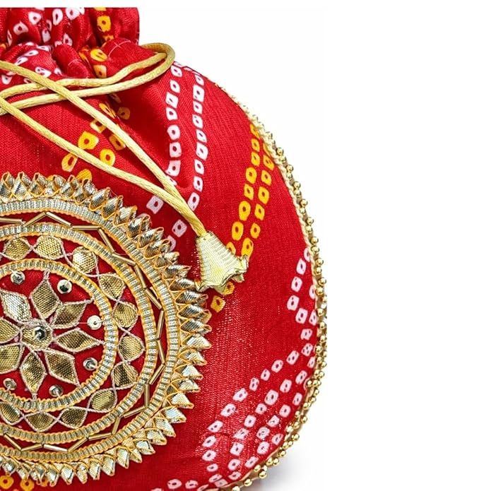 Unravel India Red Bandhani Potli Bag for Women with Pearl Handle & Heavy Zari Work | Ethnic Wedding Accessory