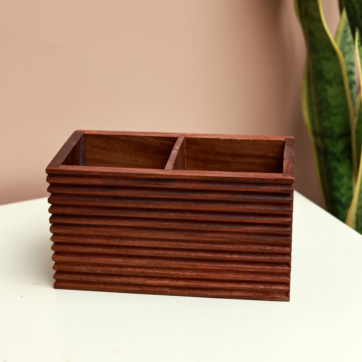 Organize your dining table with the handcrafted Sheesham wood cutlery holder. This elegant cutlery stand features multiple compartments, making it ideal for holding spoons, forks, knives, and napkins. A perfect blend of functionality and style, it enhances the aesthetics of your kitchen or dining area.
