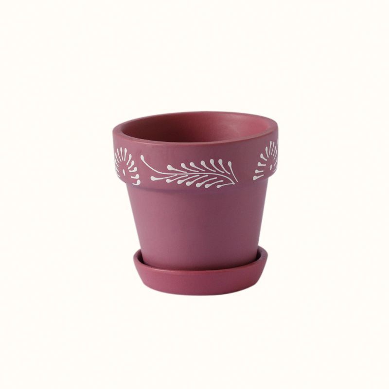 Unravel India "Swirl Motif" maroon handmade & handpainted planter pot with tray in terracotta