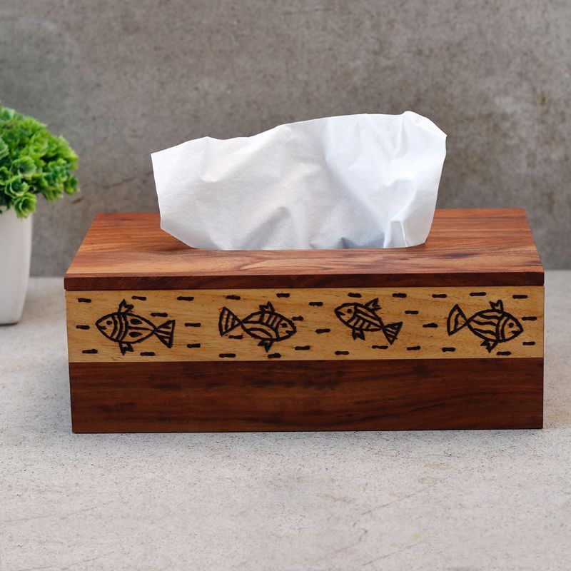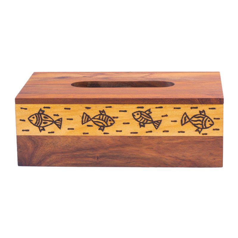 Unravel India"Wood Fusion Fish Motif" tissue holder in Sheesham wood